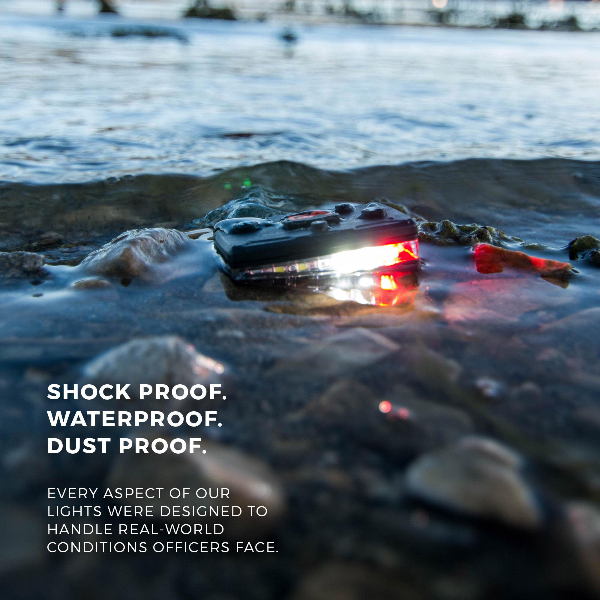 - Shockproof: Drop it. Run it over. It’s all good. Our lights are built with industrial-strength materials to make sure they can handle the rigors of any job or activity.